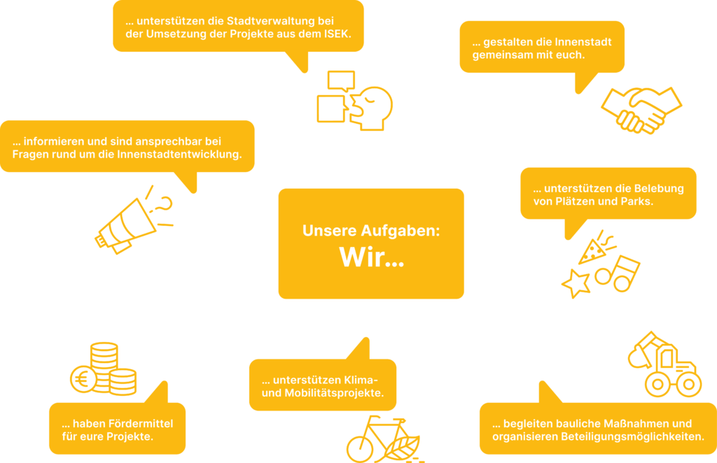 Ziel ist es, gemeinsam mit vielfältigen Akteur*innen, der Stadt Witten, einer bunten Bürger*innenschaft und der Politik die Wittener Innenstadt als attraktiven Wohn-, Lebens- und Arbeitsstandort zu stärken.